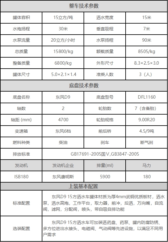 東風(fēng)D9 15方灑水車配置: