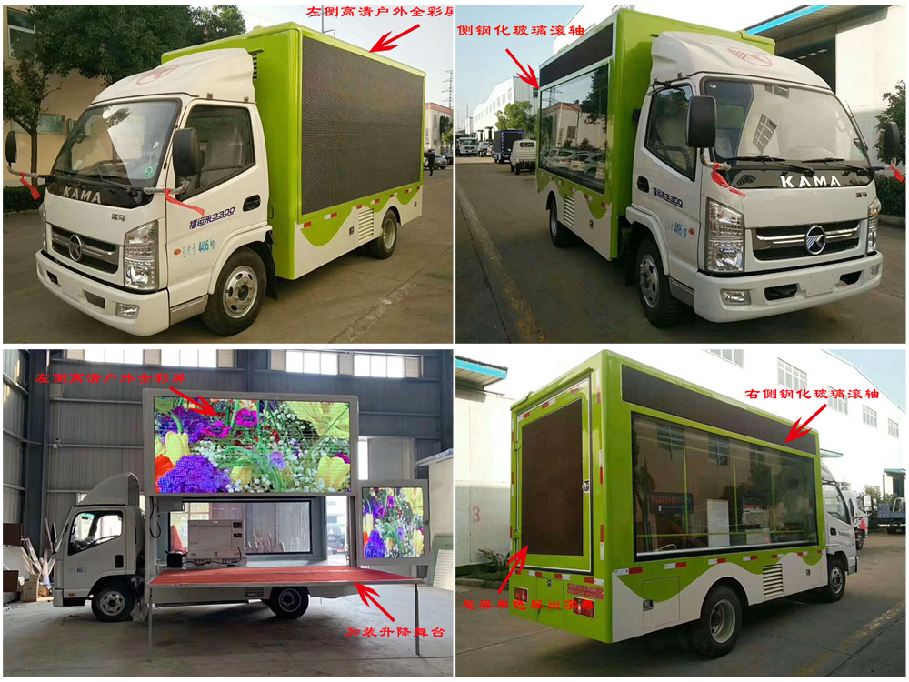 廣告車選裝配置:客戶可根據(jù)需求選裝屏幕清晰度(P10彩屏、P8彩屏、P6彩屏、P5彩屏、P4彩屏)、單面彩屏、雙面彩屏、雙面