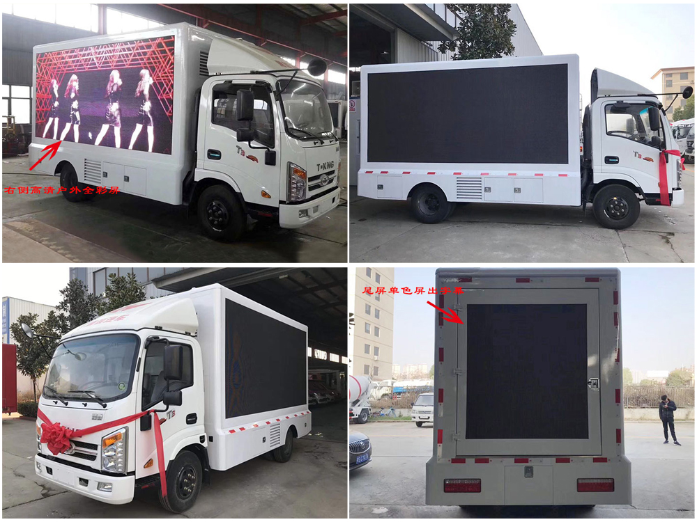 廣告車選裝配置:客戶可根據(jù)需求選裝屏幕清晰度(P10彩屏、P8彩屏、P6彩屏、P5彩屏、P4彩屏)、單面彩屏、雙面彩屏、雙面